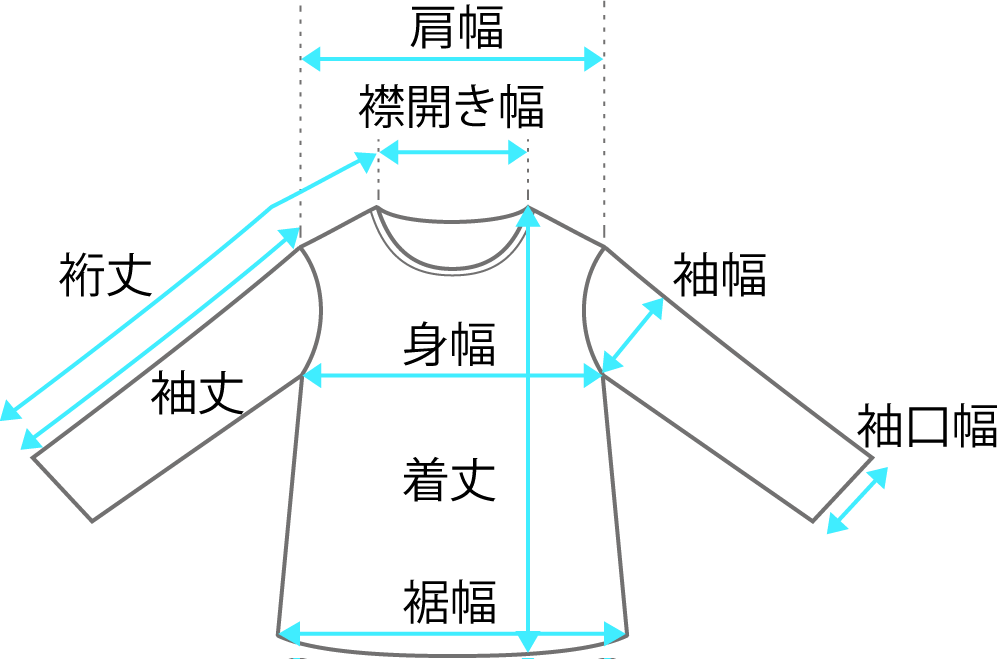 | サイズ | 着丈 | 肩幅 | 身幅 | 裾幅 | 袖丈 | 袖幅 | 袖幅口 | ウエスト幅 | ヒップ幅 |